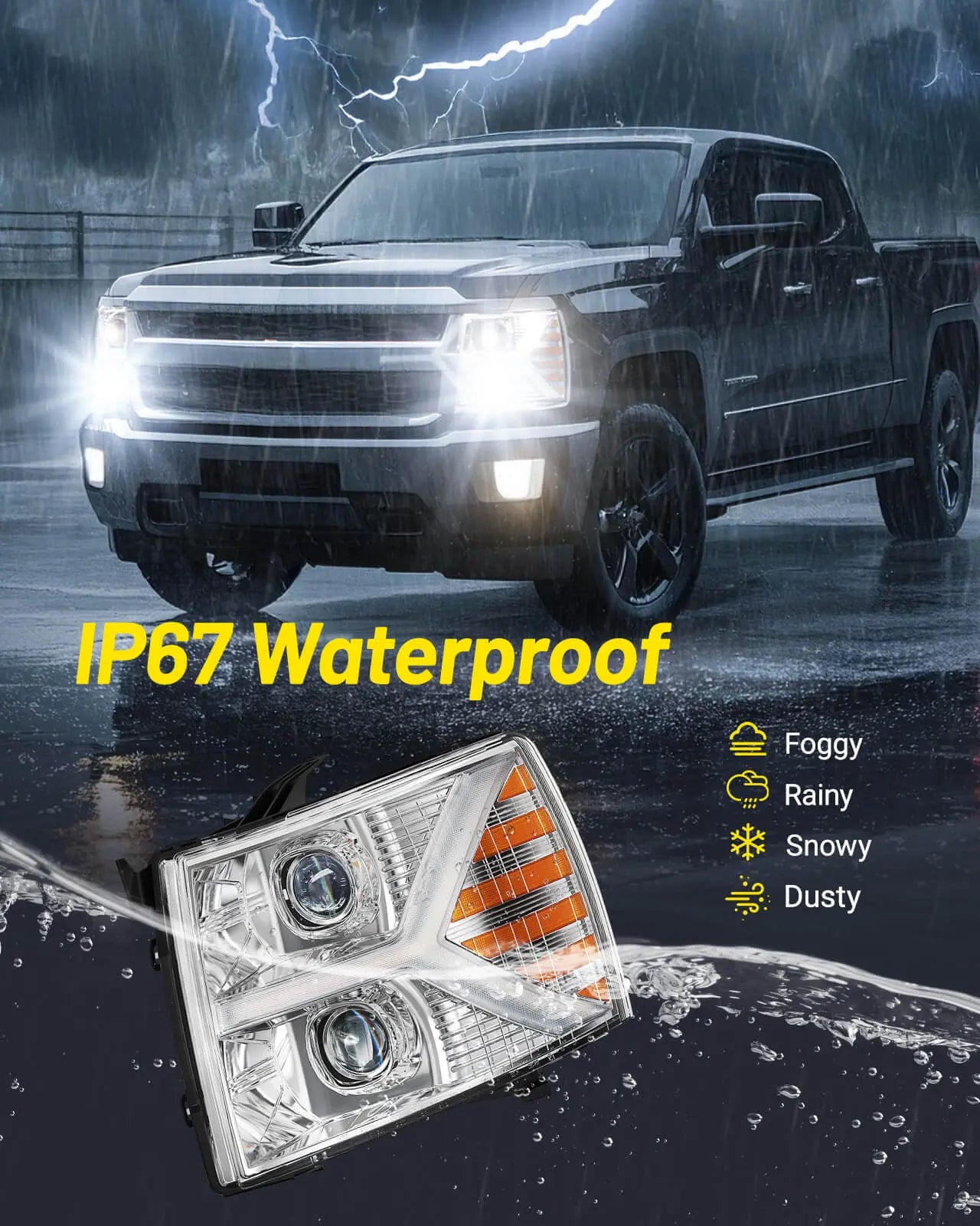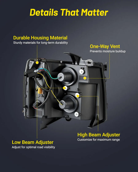 Built with impact-resistant ABS and sealed with premium silicone, this headlight assembly set offers reliable IP67 waterproof protection against rain, snow, and dust. Plus, its dual one-way vents prevent condensation, keeping lenses clear and fog-free in all conditions.