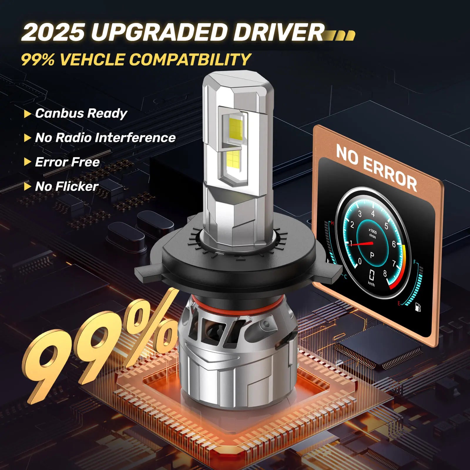 Each H4/9003/HB2 LED bulb in the P2 Series is equipped with 24PCS CSP LED chips, delivering an impressive 130W and 40000LM output. It ensures up to 600% more brightness than traditional halogen bulbs. Whether you're on a dark highway or navigating tough terrains, these H4/9003/HB2 light bulbs provide crystal-clear visibility for enhanced safety. The 360-degree adjustable ring ensures a perfect beam pattern, eliminating dark spots and glare. Choose the best H4/9003/HB2 headlight bulbs to light your path with reliability and brilliance.