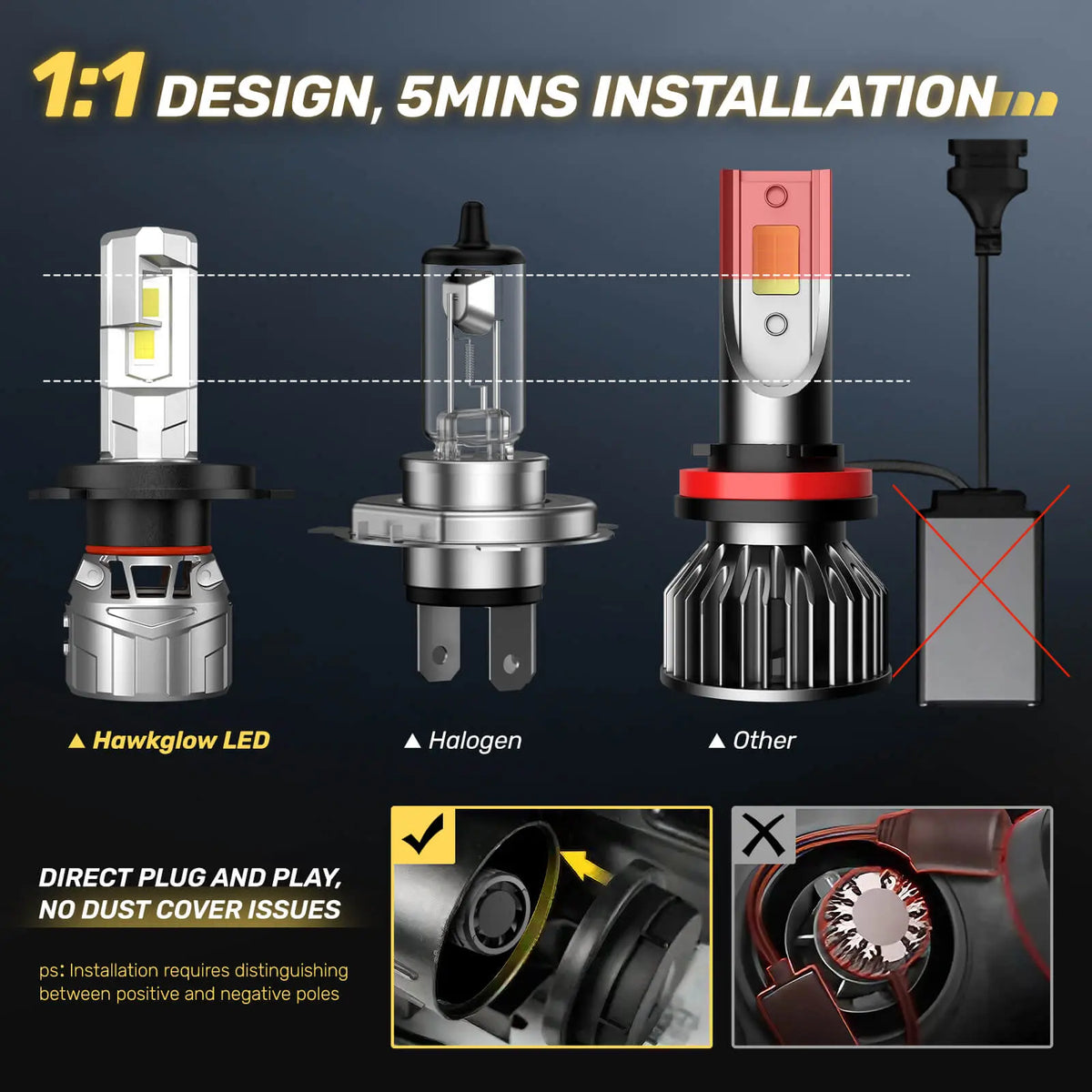 Hawkglow's P2 series H4/9003/HB2 LED wired bulbs incorporate an innovative all-in-one design, eliminating the need for an external driver box. This design perfectly matches the dimensions of standard halogen bulbs,making installation hassle-free and addressing common issues like dust cover fitment.