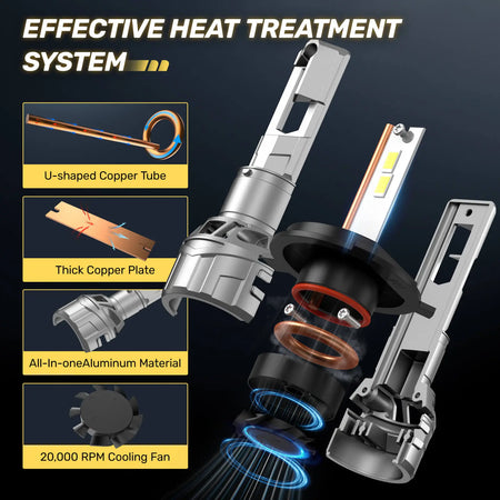 P2 Series H4/9003/HB2 LED bulbs use U-shaped copper tube and thickened copper plate for heat control, regulate temperature during prolonged use, ensuring consistent performance without overheating, reducing the risk of light decay or failure. P2 series incorporates High-Speed fan with 15,000 RPM speed, All-In-oneAluminum Material and a built-in finned heat sink for superior cooling. This advanced heat management system ensures the high power H4/9003/HB2 LED bulbs remain stable even during extended use.