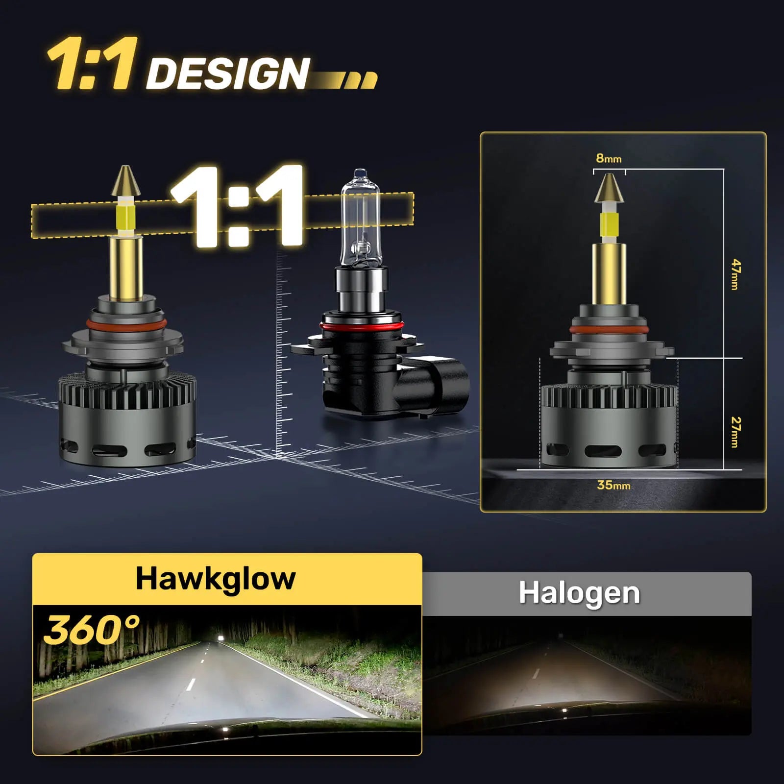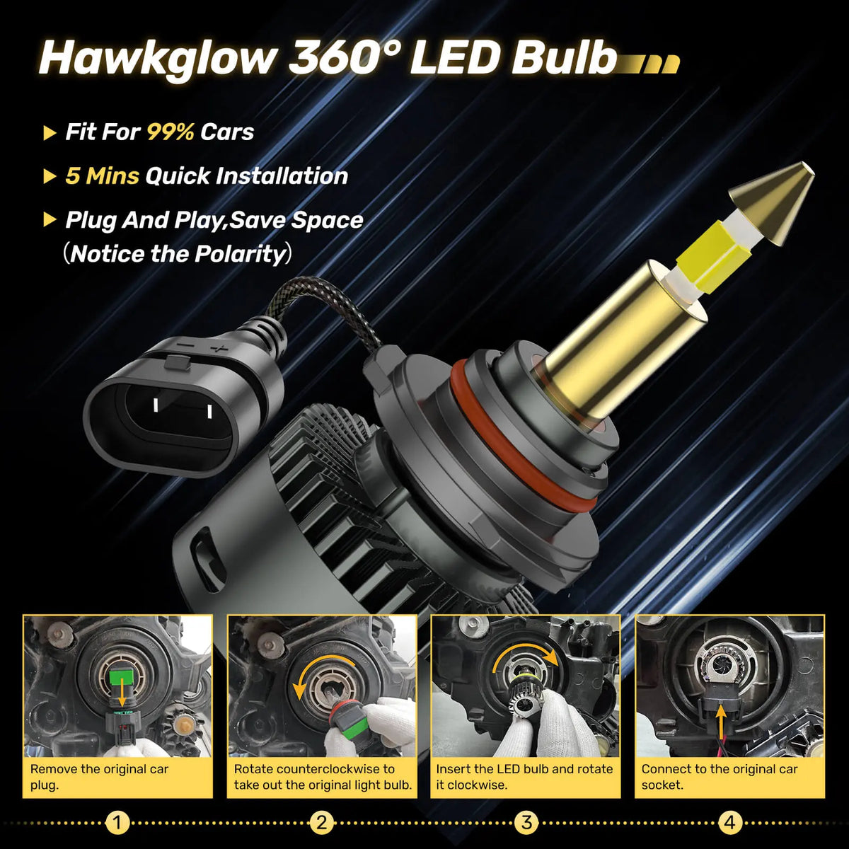 Say goodbye to complicated installations! The 9005/HB3, 9006/HB4 LED bulb 1:1 design with original halogen lamp, requiring no additional adapters. Simply plug and play, and enjoy enhanced lighting performance in just 5 minutes.