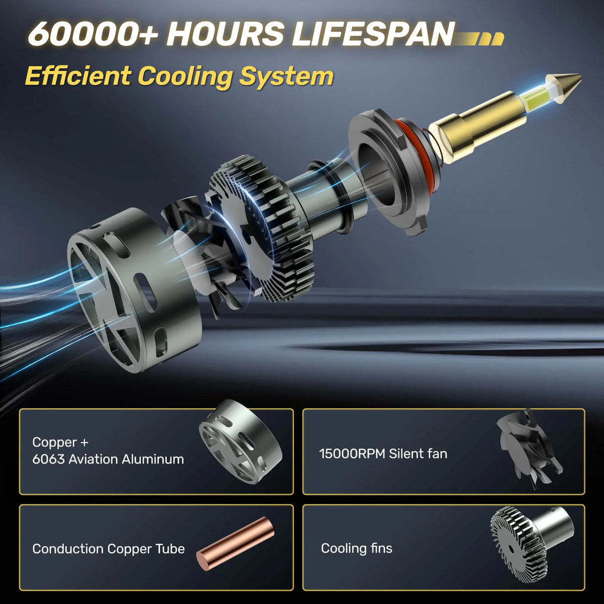 Hawkglow’s RD09 bullet seriers automotive led headlight bulbs feature advanced cooling with copper tubes for rapid heat transfer, CNC-machined aluminum housing for durability, and a high-speed cooling fan to prevent overheating. These technologies ensure the 360° LED headlight bulbs last over 60,000 hours of reliable performance.