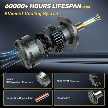 Hawkglow’s RD09 bullet seriers automotive led headlight bulbs feature advanced cooling with copper tubes for rapid heat transfer, CNC-machined aluminum housing for durability, and a high-speed cooling fan to prevent overheating. These technologies ensure the 360° LED headlight bulbs last over 60,000 hours of reliable performance.